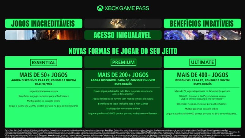 Game Pass Ultimate: segue como a opção mais completa, reunindo os benefícios de todas as modalidades, incluindo títulos day one, jogos na nuvem e catálogo para PC.